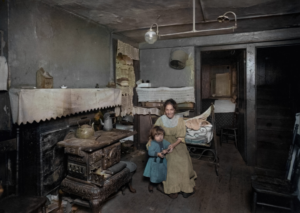 Портрет иммигрантки, позирующей рядом с печью вместе со своим ребенком в трущобном многоквартирном доме, Нью-Йорк, 1911 год.