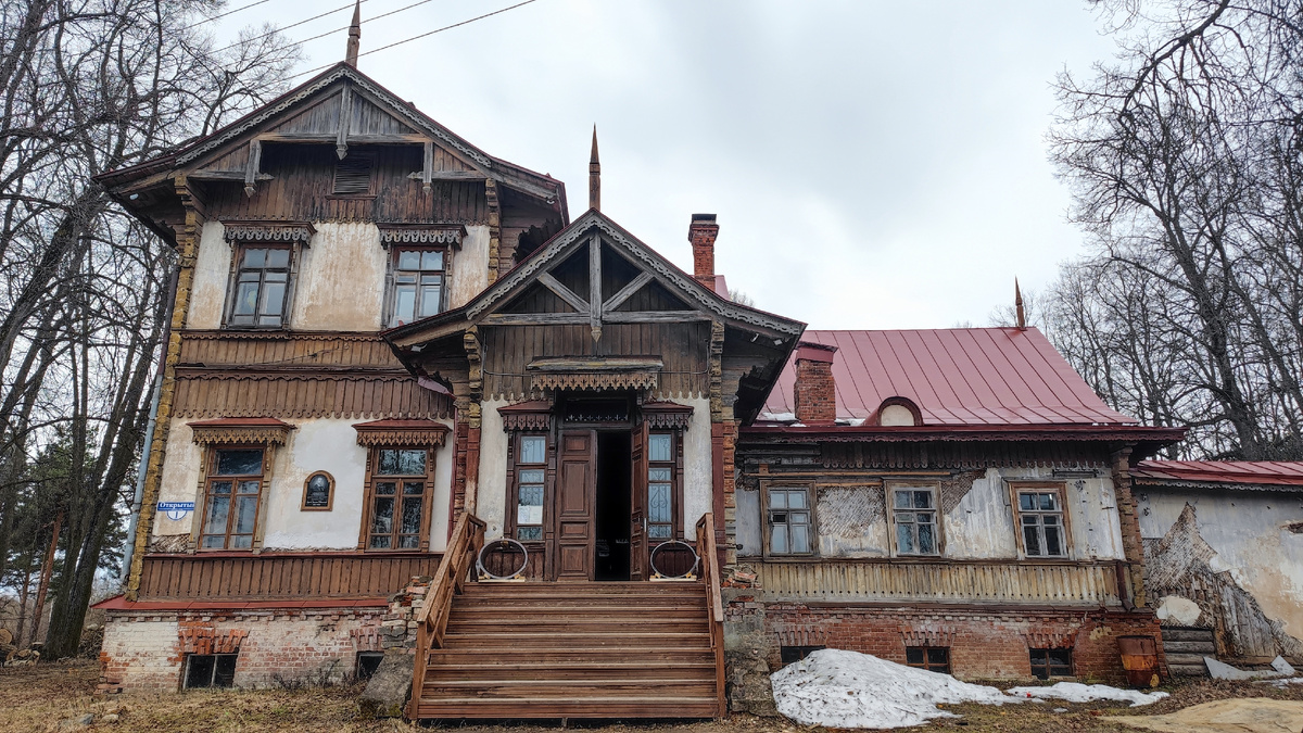 Дача Рябушинского, на которую мы бы просто так не попали бы, не будь с нами краеведа-экскурсовода Дениса Ивлева. Дело в том, что в 2018 году это здание вообще собирались сносить за ветхостью и ненужностью. Но Денис настоял на том, что это памятник архитектуры и его необходимо сохранить. Ему удалось договориться, чтобы в течение 50 лет дачу восстановили. Как видно на фотографиях, работы продвигаются медленно, но восстановление идет благодаря волонтерам и средствам, собранным с экскурсий, а также возможным добровольным пожертвованиям. Первым шагом стало создание резиденции для художников. На втором этаже дома, где не проводят экскурсии, оборудованы жилые помещения. Условия проживания, учитывая удаленность места, близки к полевым — дача находится в глухой местности, окруженной болотами. Но у этого есть несомненные преимущества: возможность пожить в исторических интерьерах, а также то, что творческие люди, обитающие здесь, могут помочь в реставрации и преобразовании усадьбы. Хозяевами до