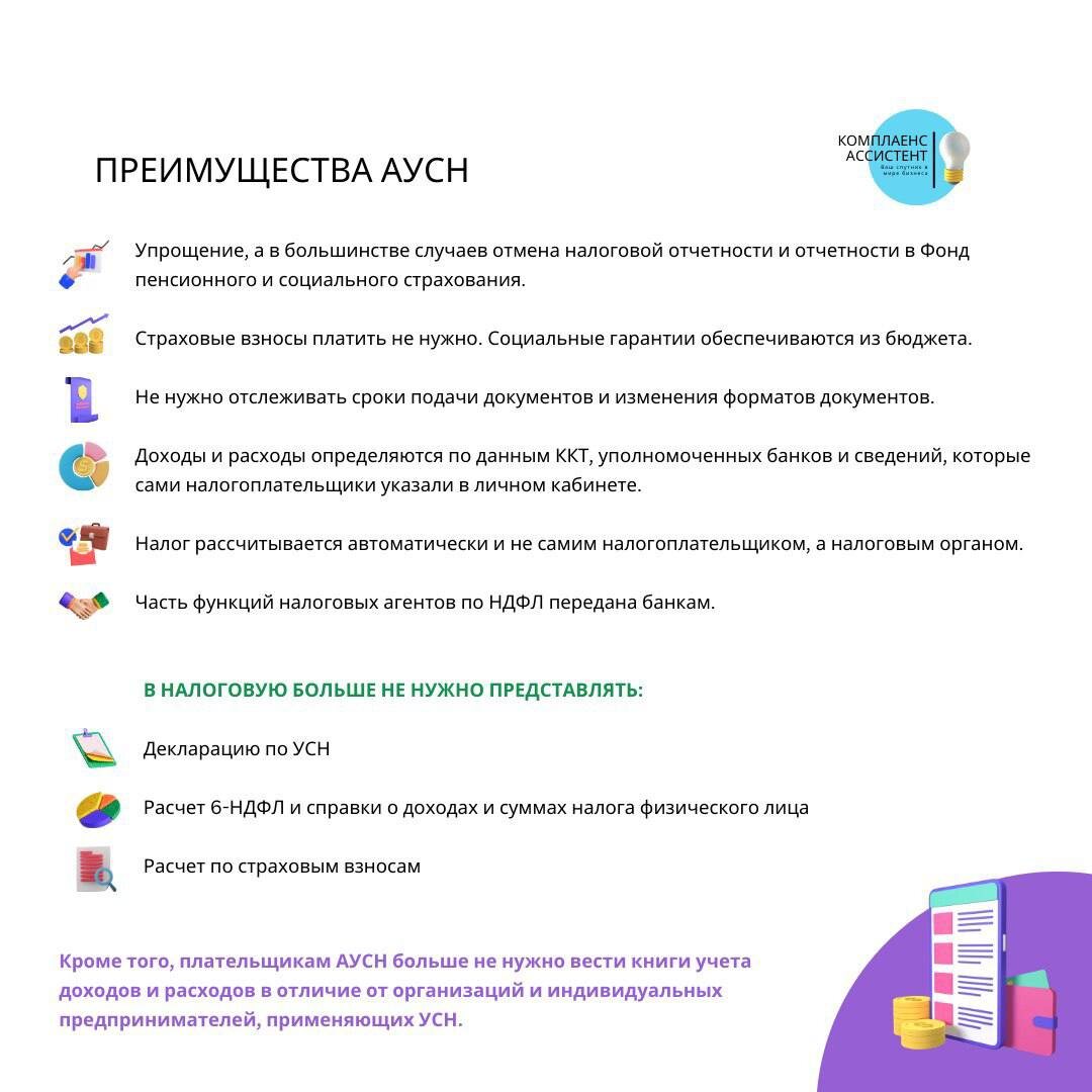 Переход на АУСН в 2025 году 🟢 Автоматизированная упрощённая система налогообложения (АУСН) — это специальный налоговый режим для малого бизнеса, при котором налог рассчитывается автоматически, а отчётность практически полностью отменяется. Специальный налоговый режим установлен Федеральным законом от 25.02.2022 № 17-ФЗ. Перейти на автоматизированную УСН могут компании и ИП при соблюдении следующих условий: - численность персонала не более 5 человек; - годовая выручка не более 60 млн рублей; - расчетный счет открыт в уполномоченном банке; - заработная плата перечисляется только по банковскому счету; - налогоплательщик не применяет иные налоговые режимы; - остаточная стоимость основных фондов — не более 150 млн рублей (только для юр. лиц); - нет филиалов и представительств (только для юр. лиц); - доля участия других организаций в уставном капитале — не более 25% с учетом особенностей, указанных в 17-ФЗ (только для юр. лиц). На АУСН не могут работать банки, НКО, ломбарды, микрофинансо