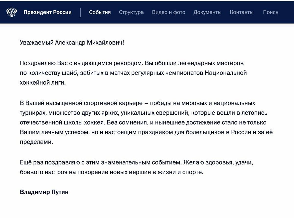 ⚡️Владимир Путин поздравил Александра Овечкина с его историческим рекордом по числу заброшенных шайб в регулярных чемпионатах НХЛ