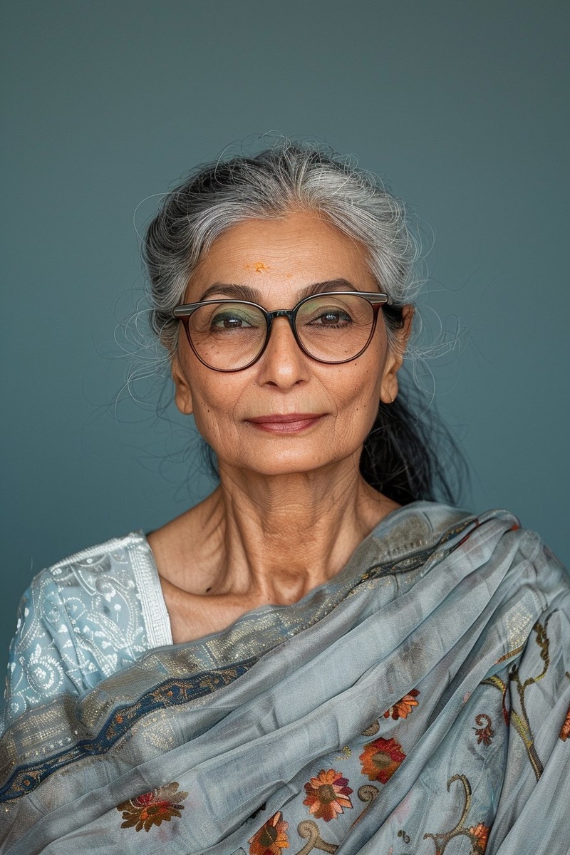 Создано на основе запроса: realistic headshot portrait of an Indian female in her late 50s, traditional saree, dignified appearance, subtle