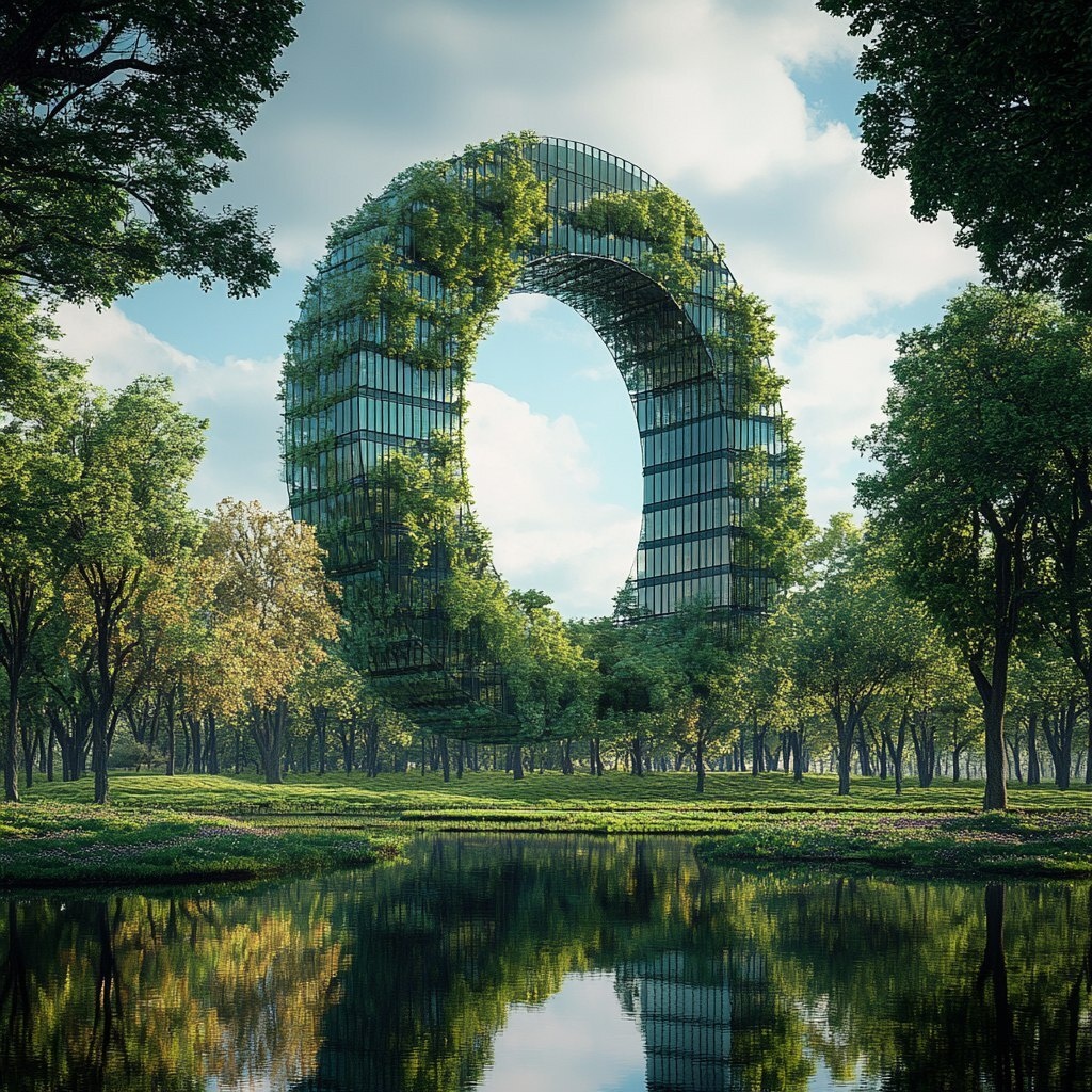 Создано на основе запроса: Fotorealistische Darstellung eines Gebäudes in Form der Zahl 0 inmitten einer Parklandschaft