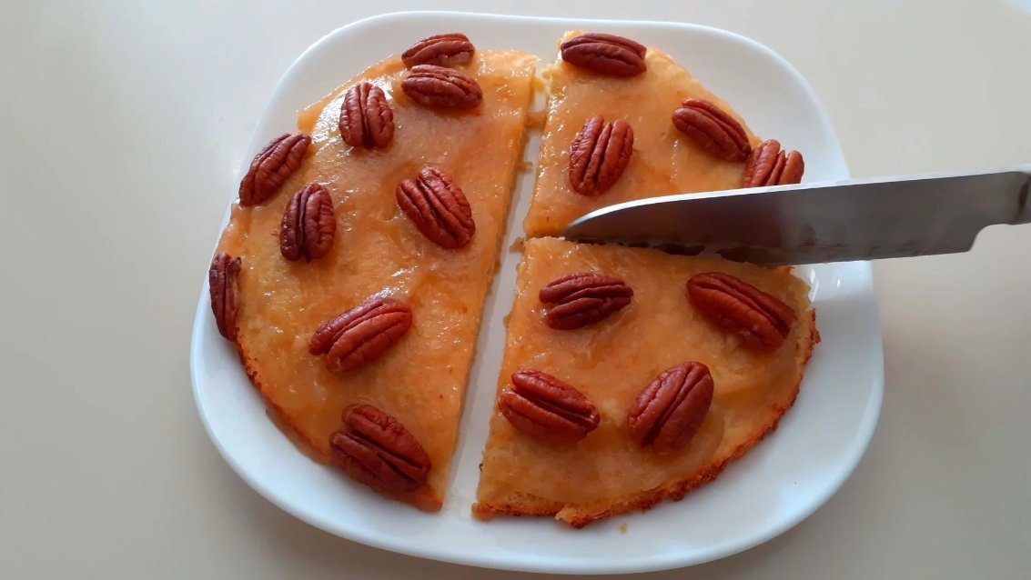 Сегодня готовлю невероятно нежный и ароматный кето пирог «Осенний» с яблочным пюре, без сахара и орешками пекан. Пирог готовится очень просто и быстро в один замес, а потому, чтобы сделать вкусную выпечку к чаю понадобится совсем немного свободного времени и чуточка усилий. Результат приятно порадует вкусом и нежной текстурой, это я гарантирую. 1. Яйца – 2 шт.; 2. Сметана – 20 г.; 3. Кокосовая мука – 30 г.; 4. Подсластитель – 30 г.; 5. Разрыхлитель – 5 г.; 6. Ванилин – щепотка; 7. Яблочное пюре; 8. Орехи пекан. Подсластитель эритритол, но вы можете использовать по своему вкусу иной органический подсластитель. Более подробное описание рецепта, а также особенности и мерные значения по продуктам смотрите в рекомендациях, которые я всегда оставляю под каждой публикацией. Способ приготовления: В яйца всыпаю эритритол и ванилин. Взбиваю на миксером до получения пышной массы в течение 2х минут. Добавляю сметану. Недолго перемешиваю. Всыпаю кокосовую муку и разрыхлитель. Недолго перемешиваю до