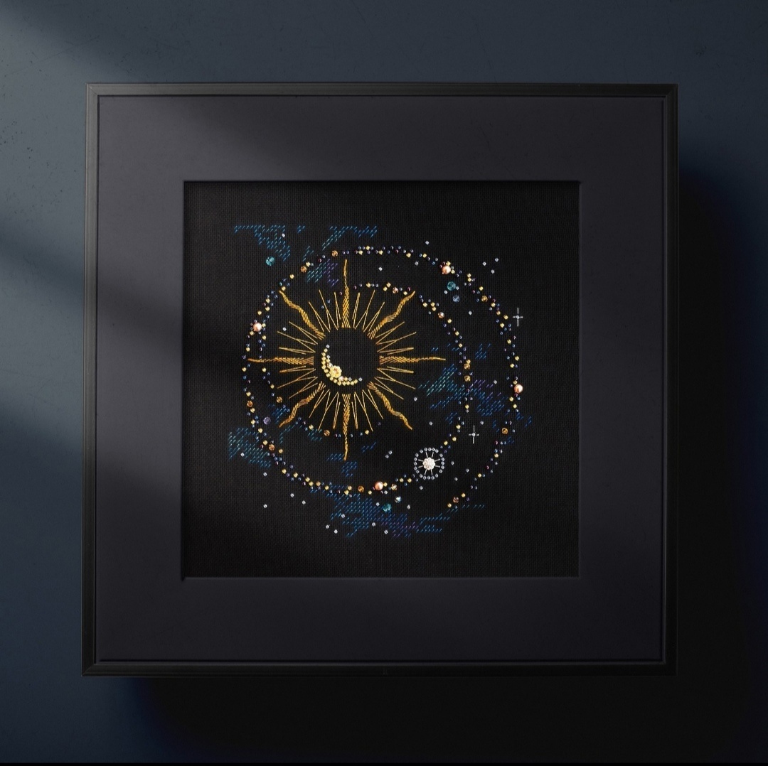 Как всегда, на носу День космонавтики и мне приспичило что-то вышить на космическую тему... Да, и ещё убить двух зайцев, успеть принять участие в конкурсе... Время, как всегда поджимает. И как говориться, как специально мне на глаза попадается сюжет одного дизайнера, очень простой и маленький. Естественно я оплатила 200руб., купила схему, основа, нитки и бисер у меня были... и тут началось... Дизайнер в подборке указывает стразы, бисер разного размера, но мне не захотелось заморачиваться и ради 2-3 бусин покупать пачку. В каком-то из вышивальных обменов мне подарили основу, мне кажется это Linda ct27, я если честно даже не рассматривала клетку😂. Вообще я люблю вышивать на чёрной канве, но Линда 27 это мрачный мрак.... Я даже не поняла, что и куда. Быстро на ВБ, заказала канву 16ct, не заморачивалась с покупкой страз, решила сделать из того, что есть и приступила к работе. Шовчиковая техника оказалась не сложной, но в то же время на канве, а не на равномерке это выглядит наверно и