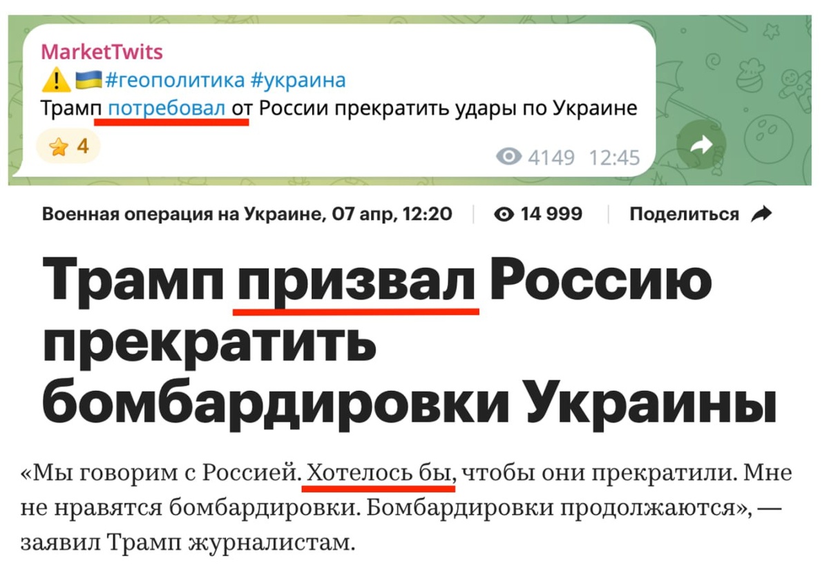 Сначала новость в телеге, где Трам ПОТРЕБОВАЛ от России...