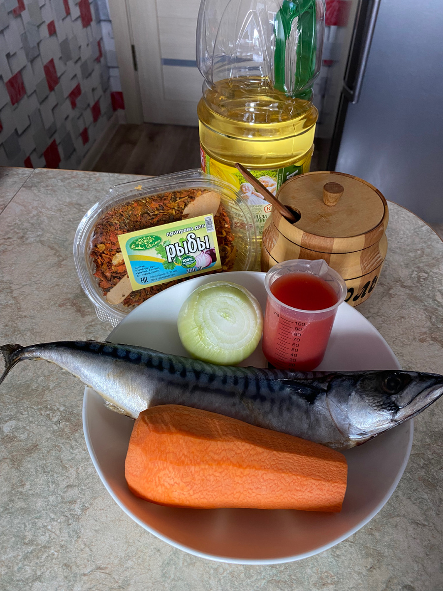 Сегодня радостный праздник-Благовещение Пресвятой Богородицы! В этот день, не смотря на Великий пост, даже в монастырской кухне дозволяется употребление рыбы. И поэтому мы с вами будем готовить скумбрию с овощами. Способ приготовления несколько необычный, зато простой и рыбка получается очень вкусной, нежной и аппетитной) Для приготовления нам понадобится: 1 скумбрия; 1 луковица; 1 морковь; 2-3 ст. л. растительного масла; 100 мл томатного сока (у меня собственного приготовления); 1 ч. л. приправы для рыбы (смесь из кориандра, лука, куркумы, базилика, сладкого перца и укропа); 1 ч. л. соли Начнем с того, что подготовим продукты: Теперь укладываем продукты слоями в банку (у меня объемом 1 литр): Слои повторяем еще раз. Сверху выкладываем оставшиеся лук и морковь, томатный сок, приправу для рыбы и соль. Горлышко банки плотно закрываем фольгой. Банку с рыбкой и овощами ставим в холодную духовку, включаем режим «верх-низ» с конвекцией, выставляем температуру 170-180 градусов и готовим в те