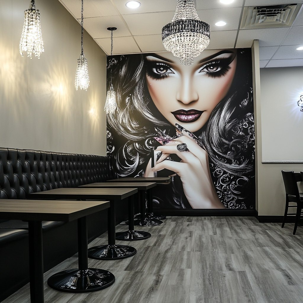 Создано на основе запроса: A wall of a nail salon is decorated with a picture of a stylish woman doing nail art.There are no chairs, tables