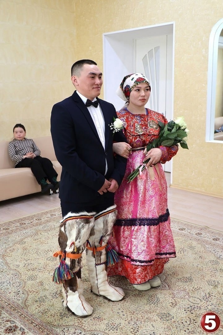 Такой свадьбы в Инте ещё не было 😳🧊 Иван — пастырь оленей, Ольга — хранительница очага в чуме. Познакомились молодые люди в соцсетях, полгода общались, а потом Иван приехал из Нарьян-Мара в Харуту за своей возлюбленной. 💍 4 апреля работники интинского загса и центра нацкультур устроили для молодожёнов настоящий праздник в национальных традициях!