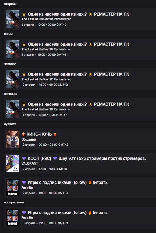 📢🗓 РАСПИСАНИЕ 🗓 📆 ВТ. 08.04 - ЧТ.10.04 ⏰ 19:00 🎮 The Last of Us Part II: Remastered ⭐️ Один из нас или один из них!? ⭐️ 📆 ПТ. 11.04 ⏰ 19:00 🎮 The Last of Us Part II: Remastered ⭐️ Один из нас или один из них!? ⭐️ ⏰ 00:00 🍿 КИНО-НОЧЬ 🍿 📆 СБ. 12.04 ⏰ 17:00 🎮 VALORANT 💜 КООП [FSC] 💜 Шоу матч 5х5 стримеры против стримеров. ⏰ 19:00 🎮 FORTNITE 💜 Игры с подписчиками (follow) 🔥 📆 ВС. 13.04 ⏰ 19:00 🎮 FORTNITE 💜 Игры с подписчиками (follow) 🔥 1️⃣ Приходите смотреть на Twitch и ставь ❤️ на VKВидеоLive!! ⏺ Все наши ресурсы.
