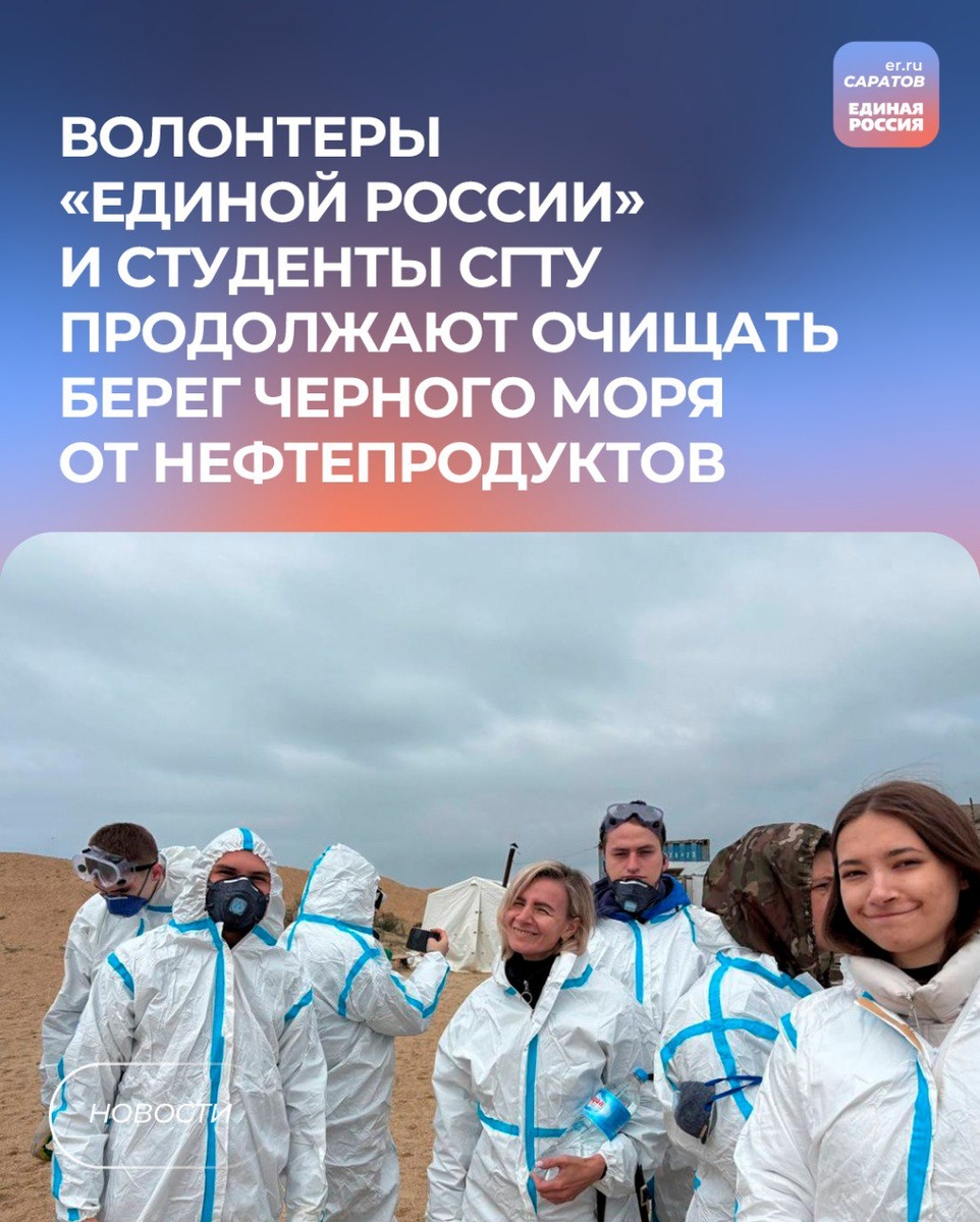 🌊 Волонтеры «Единой России» и студенты СГТУ продолжают очищать берег Черного моря от нефтепродуктов