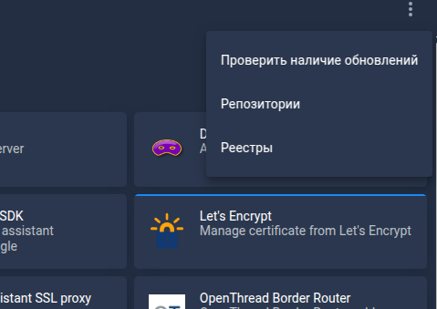 Идем в Настройки->Дополнения. Жмякаем на кнопку "Магазин дополнений" и выбираем в правом верхнем углу пункт в меню (по трем точкам) "Репозитории". Добавляем репозиторий https://github.com/zigbee2mqtt/hassio-zigbee2mqtt. Проверяем наличие обновлений, нажав кнопку в правом верхнем углу. Ищем и устанавливаем дополнение Zigbee2MQTT.