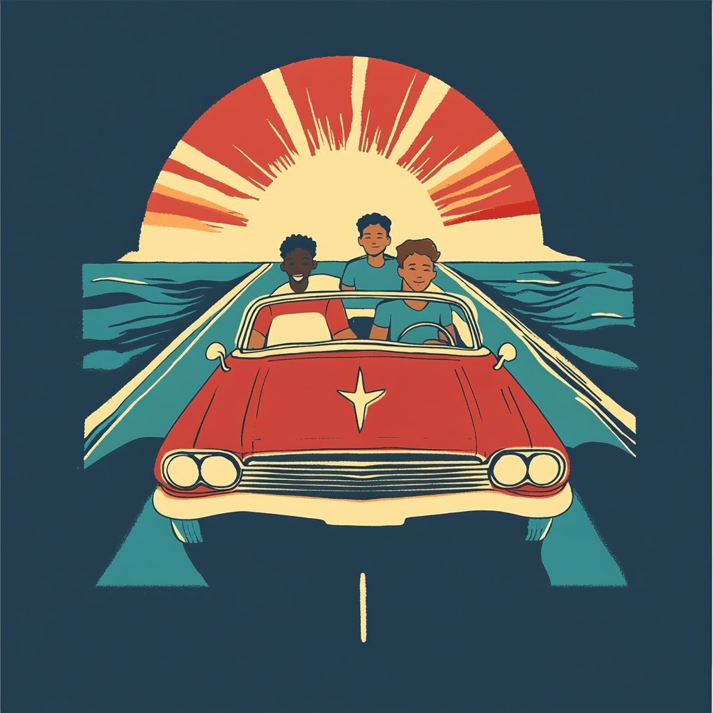 Создано на основе запроса: A logo design of three friends on a road trip, two Black boys and one Caucasian boy, driving a vintage car along