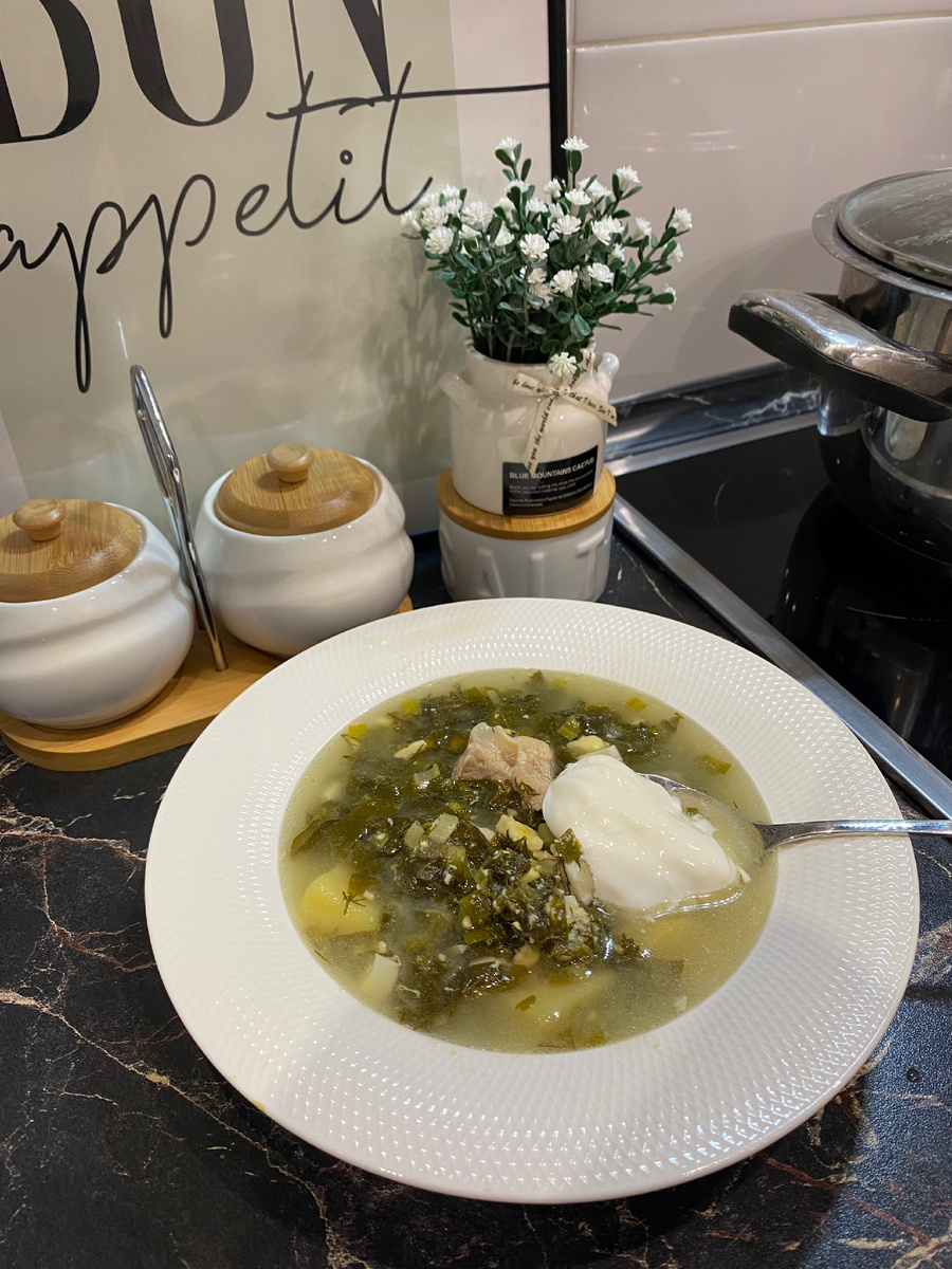 В разных регионах это блюдо называют по-разному. В Краснодарском крае это «Зеленый борщ», а где-то это «Щавелевый суп». Предлагаю свой рецепт зеленого борща. Так готовили моя мама и бабушка. Зеленый борщ приготовленный по этому рецепту, получается очень густой и насыщенный зеленью. Ингредиенты: ✔️Мясо 500 г (у меня свинина, но можно взять любое мясо) ✔️Яйца 4 шт ✔️Картофель 2-3 шт ✔️Лук 1 шт ✔️Щавель 1-2 пучка ✔️Зелень (у меня петрушка, укроп, кинза) по вкусу ✔️Зелёный лук 1/2 пучка ✔️Соль по вкусу Сначала готовим бульон. Доводим до кипения и уменьшаем огонь. Варим мясо на медленном огне в течении часа. Яйца отвариваем. Очищаем лук и нарезаем кубиком. Обжариваем лук до мягкости. Теперь нарезаем зелень, щавель и яйца. Готовое мясо достаём разрезаем на кусочки и отправляем обратно в кастрюлю. Чистим картофель, нарезаем и отправляем к мясу. Туда же отправляем лук обжаренный. Когда картофель будет готов добавляем в борщ порезанные яйца, щавель, зелень и зелён