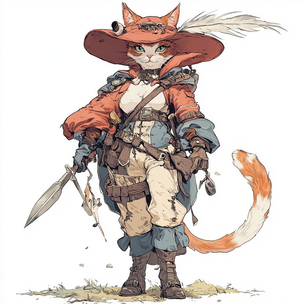 Автоперевод: Фэнтезийная концепция иллюстрация, женская, гуманоидная кошка, табакси, мех тэгдолл кот, храбрый, ведьма, пиратская одежда, большая шляпа с пером, кожаная броня, узлов в руках, стиль осьминога, белый фон, высокое качество, преувеличенная боевая поза