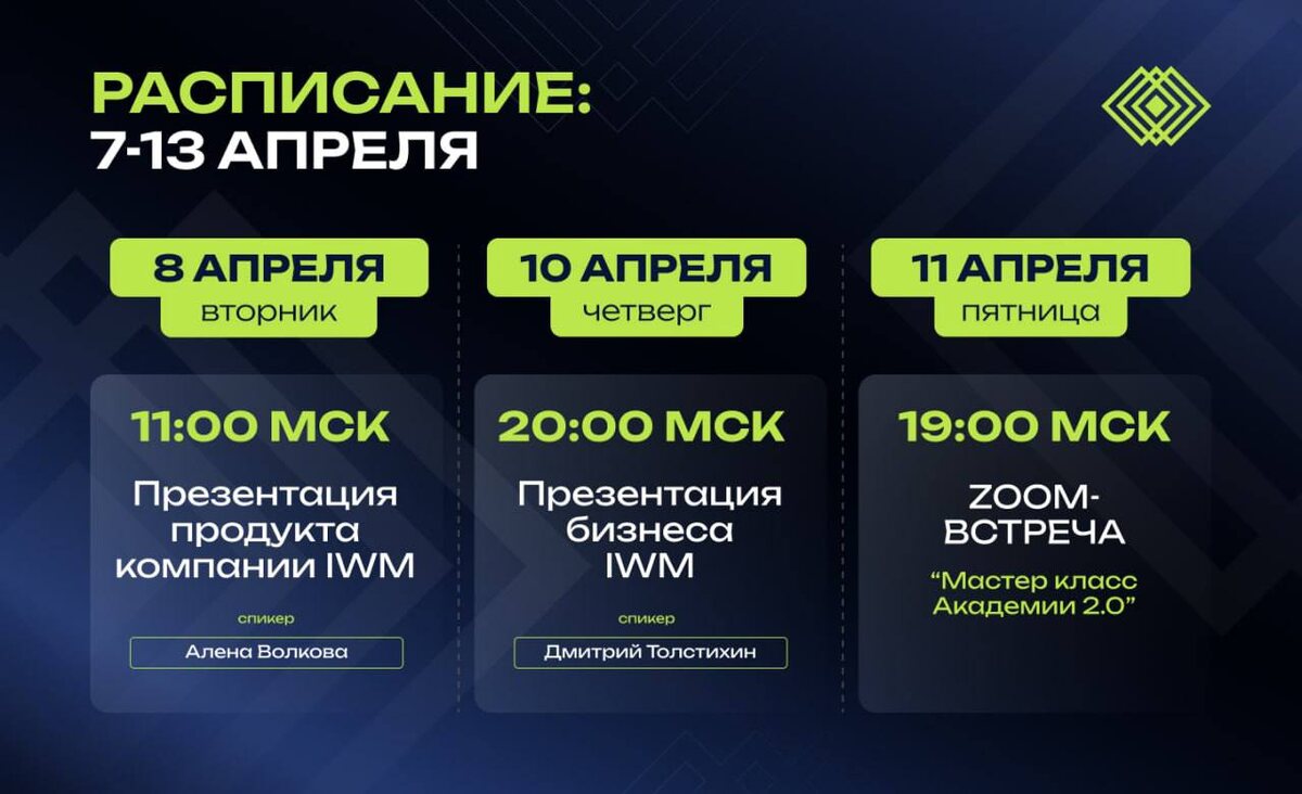 📌🖥РАСПИСАНИЕ НА НЕДЕЛЮ! Уважаемые партнеры! Мы подготовили расписание онлайн-встреч на этой неделе. Обязательно сохраните его себе и присоединяйтесь к нам. https://us06web.zoom.us/j/2116731674?pwd=xahqmhZLmGsNMAcfVYG8sNdiNWlLRY.1