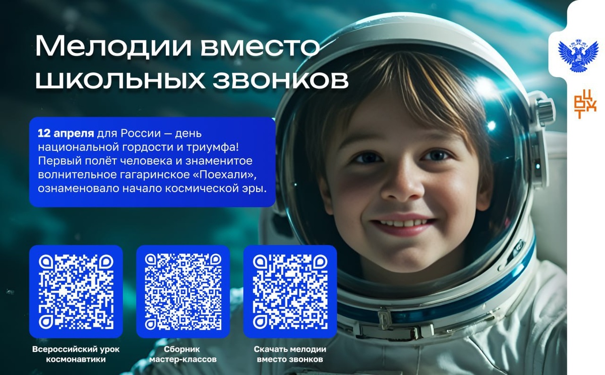 В преддверии 12 апреля во всех школах страны вместо традиционных звонков звучат фрагменты популярных песен о космосе: «Трава у дома», «Прекрасное далёко», «Надежда», «Притяжение Земли» и другие. 💬 «День космонавтики — хороший повод напомнить школьникам о великих достижениях нашей страны. Мы стремимся, чтобы изучение ключевых событий истории было не только полезным, но и интересным. Этому способствует и проект «Мелодии вместо звонков», который получил большую популярность у школьников. Он знакомит учащихся с известными музыкальными произведениями и важными историческими датами», — отметил министр просвещения России Сергей Кравцов. Минпросвещения России подготовило Всероссийский урок космонавтики «История развития российской космонавтики». Также ко Дню космонавтики выпущен тематический сборник мастер-классов с описанием занятий, возрастными рекомендациями и методическими материалами для педагогов 👉🏻 https://clck.ru/3Kv3uV Проект «Мелодии вместо звонков» запущен в российских школах в