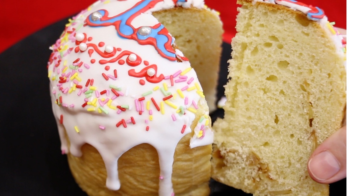 - Форма остыла, теперь можно доставать кулич. Остывшие куличи покрываем сахарной глазурью. Глазурь можно сделать из белка и пудры или сахарной пудры и воды. Сверху украшаем куличи присыпкой.