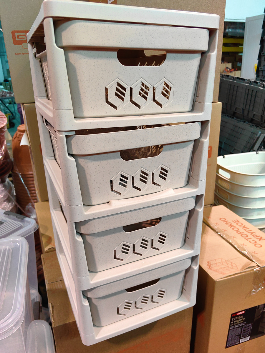 стеллаж. Как органайзер, большие корзинки выдвигаются, можно много всего разместить. Всего четыре корзины. Конструкция полностью пластиковая, но не хрупкая. По идее, у кого место позволяет, можно в ванной поставить, влаги не боится, для полотенец, разных средств, флакончиков.