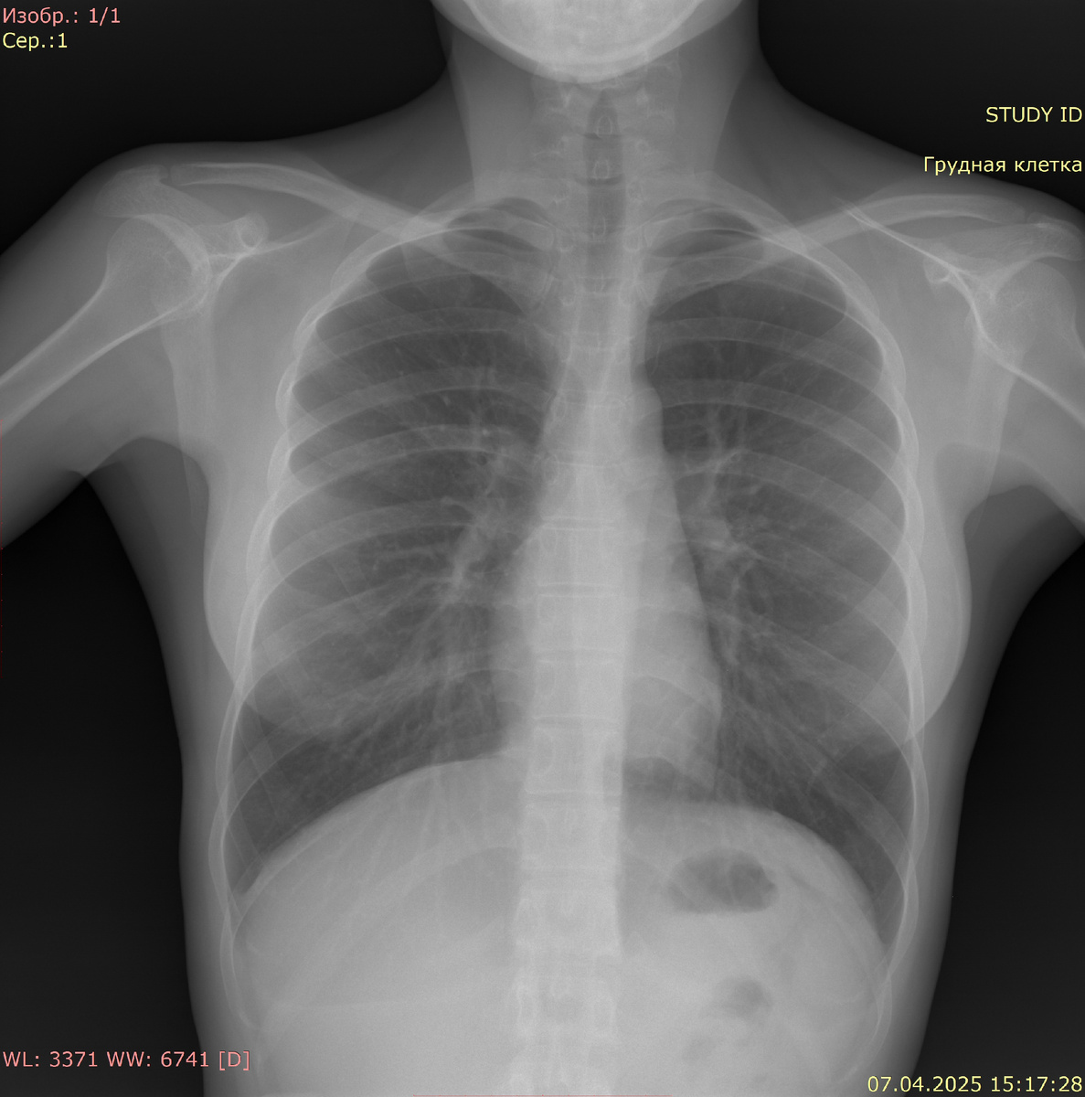 Видимые дыхательные пути проходимы. Тень средостения не смещена, не расширена. Корни легких четкие, структурные, не расширены. Очаговых и инфильтративных изменений в легких нет. Синусы свободны. Расщепление грудинного конца 5 и 6 ребра справа. Свободный газ не определяется.
