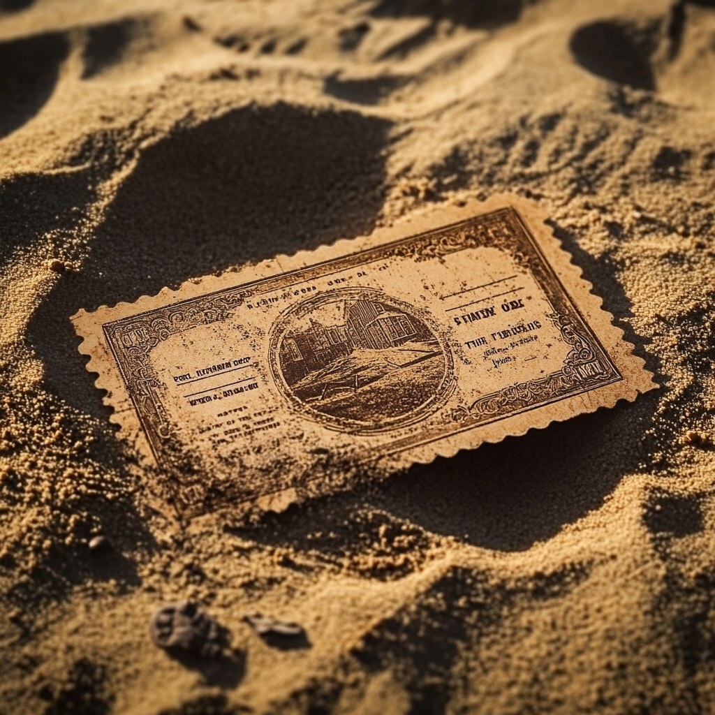 Создано на основе запроса: Desolate scene of a vintage western-style ticket lying on the barren sandy ground, partially covered by windswept grains of sand; ornate borders and classic typography faded and weathered; motifs like cowboy hats, horseshoes, and revolvers barely visible; aged paper texture with sepia tones; the environment is empty and vast, with subtle shadows and harsh lighting, evoking a sense of abandonment and solitude in the Wild West