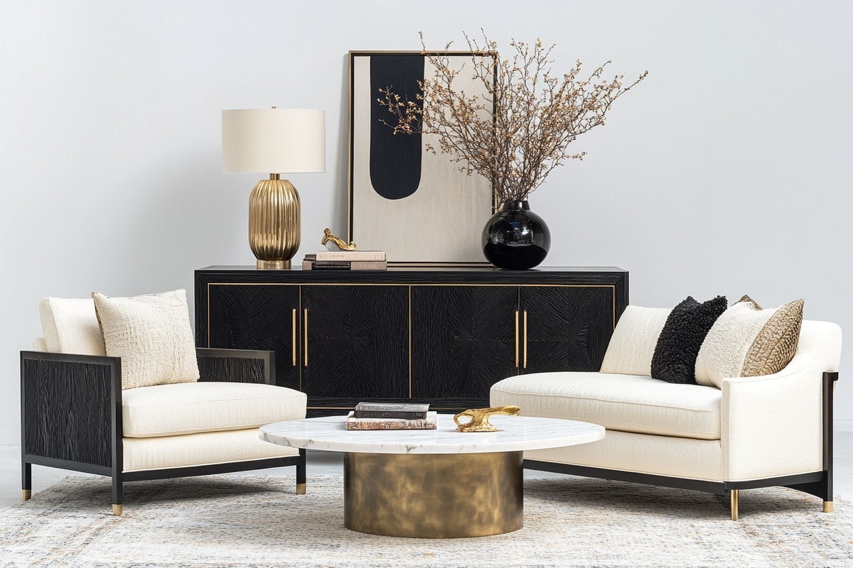 Создано на основе запроса: minimalist style luxe modern furniture shoot, cream modular base legless 1-seater sofa, black wood credenza with
