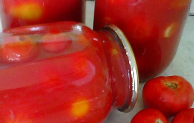 Ингредиенты: - 2 кг помидоров средней зрелости - 2 кг перезрелых помидоров - 250 г сладкого перца - ¼ стакана измельченного чеснока - ¼ стакана измельченного корня хрена - 2 ст. л. соли - 4 ст. л. сахара Приготовление: Помидоры средней зрелости аккуратно разместите в трёхлитровой банке. Перезрелые помидоры промойте, мелко нарежьте и поставьте на огонь. Варите их до полного размягчения, после чего немного остудите и перетрите через сито. Полученное пюре из помидоров смешайте с солью и сахаром, хорошо размешайте и снова доведите до кипения. Как только смесь закипит, добавьте чеснок, хрен и сладкий перец, предварительно пропущенный два раза через мясорубку. Горячую массу разлейте по банкам с помидорами и немедленно пастеризуйте: трёхлитровые банки — 20 минут, литровые — 15 минут. Закройте банки крышками, переверните их вверх дном и дайте остыть.