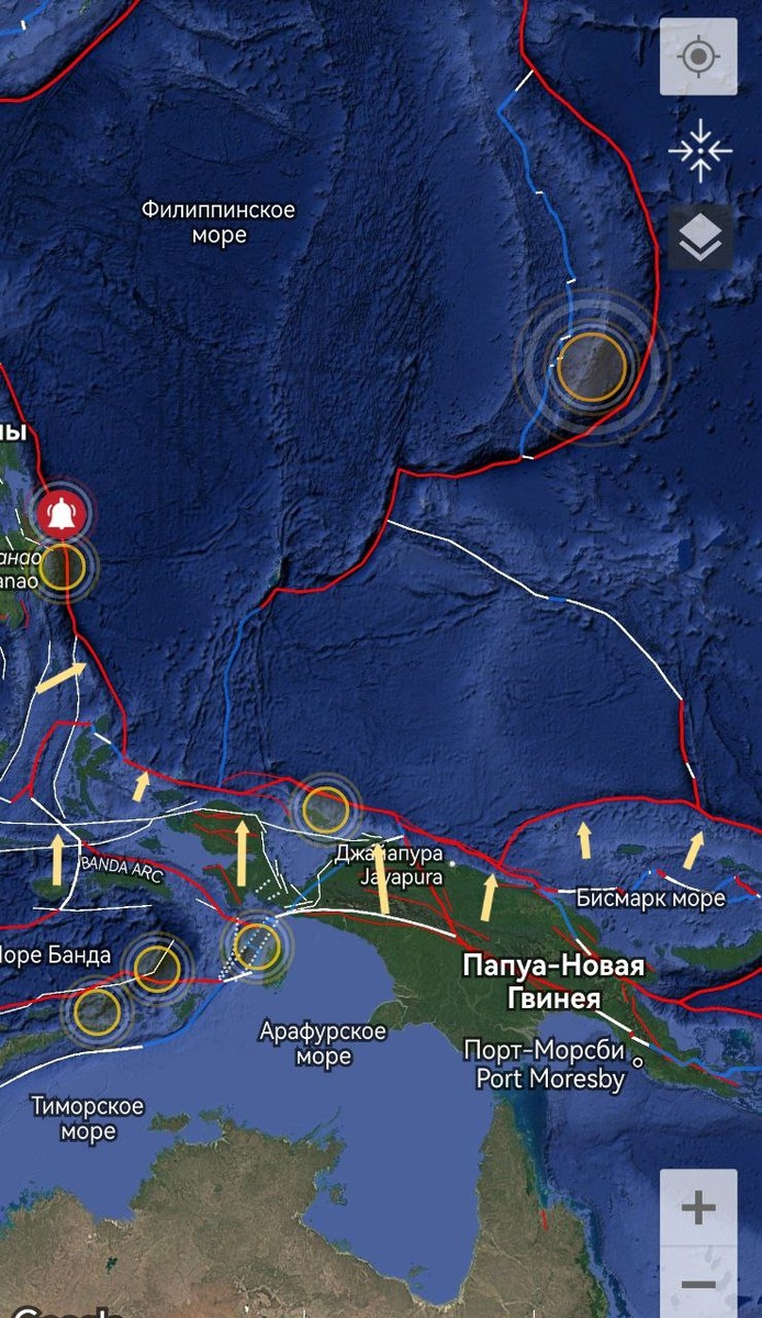 Трассируется рифтовая зона к северу от Папуа Новой Гвинеи с выходом трассера в Молуккское море. Также просматривается углообразная зона дегазации на юго-западе Филиппинской плиты. Сохраняется вероятность события М6-7+ по данной зоне до 16 апреля. ==== The rift zone to the north of Papua New Guinea is being traced, with the tracer entering the Moluccas Sea. An angular degassing zone is also visible in the southwest of the Philippine Plate. The probability of an M6-7+ event in this zone remains until April 16.