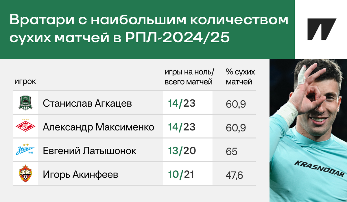 «ПСЖ», присмотрись. У «Краснодара» перед матчем с «Зенитом» четыре победы в РПЛ подряд с общим счетом 10:0. Такую долгую сухую серию клуб выдавал лишь раз в истории – в 2016-м. Символ надежности – вратарь Станислав Агкацев, у него 14 сухарей и всего 13 пропущенных в 23 матчах. Сейчас он лидирует в РПЛ по сухим играм. Кстати, совсем рядом еще один воспитанник «Краснодара» Евгений Латышонок, у которого процент сухарей даже повыше. Upd: Александр Максименко после победы над «Ростовом» (3:0) оформил 14-й сухарь и тоже вышел в лидеры. Однако Агкацев нацелен на вечный рекорд по матчам на ноль за сезон – его с 2002-го удерживает Сергей Овчинников. Задача практически невозможная, но теоретически еще реальная. У Овчинникова 20 сухарей за сезон. Без золотого матча – 19, столько же набирал Акинфеев Благодаря Opta мы знаем статистику по этому показателю с 1999 года. По их данным, Агкацев с 14 играми на ноль еще даже не в топ-15. Но Станислав – уже главный эксперт по сухарям в истории «Краснодара».