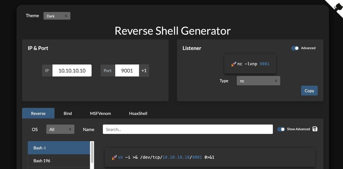 📞 RevShells — это сервис, предоставляющий пользователям возможность быстро создавать команды для обратных оболочек и соответствующие