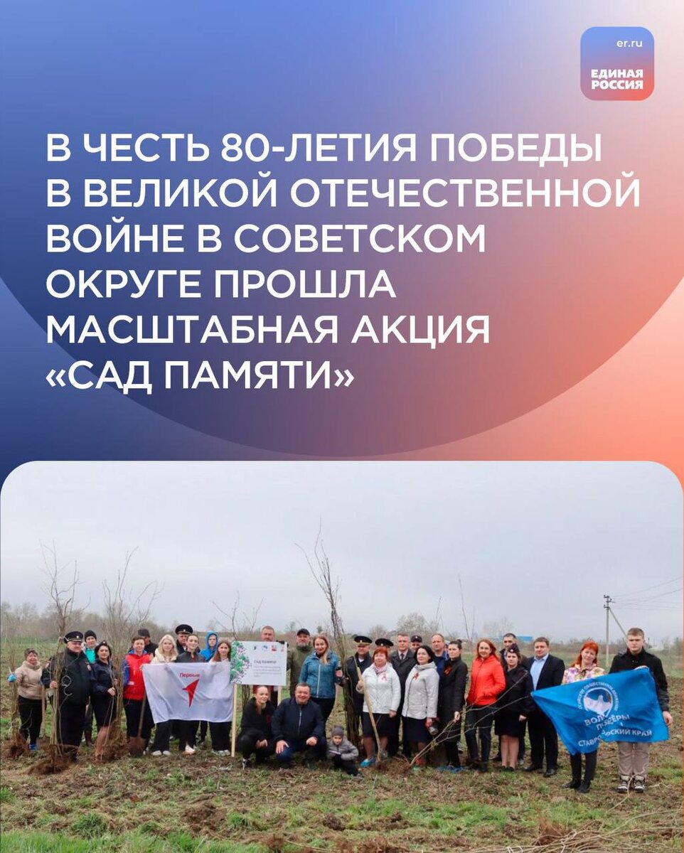 В г. Зеленокумске высажены 300 саженцев ясеня и 100 белых акаций. Сад Памяти располагается по набережной от детского сада «Радуга» до стадиона «Молния», на ул. Новой (рядом с детским садом «Радуга»). В мероприятии приняли участие: глава округа, секретарь Советского местного отделения «Единой России» Сергей Гультяев, депутаты Совета депутатов Советского муниципального округа, члены партии «Единая Россия», сотрудники Отдела МВД России «Советский», работники районных суда и прокуратуры, активисты «Движения первых», волонтёры Молодёжного центра Советского района.