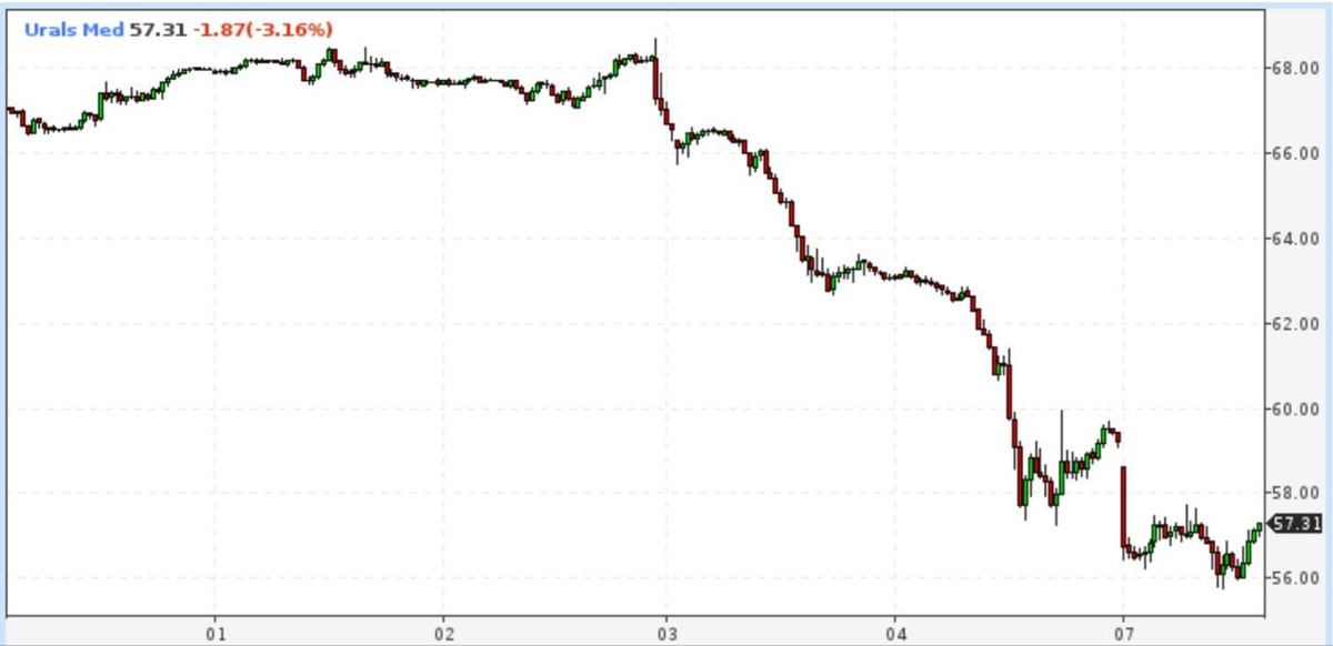⛽ Да..., нефть Urals сейчас очень волатильна, в пятницу дошла до 50$/баррель, сейчас пока $57