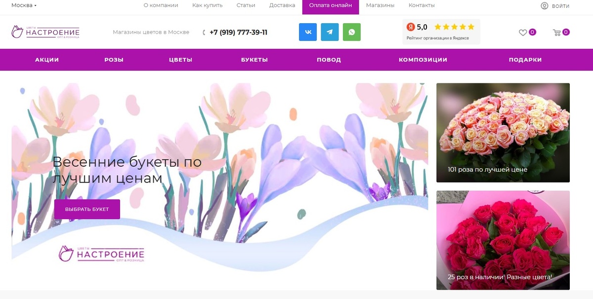 1. «Настроение» (https://msk.buket-podarki.ru/) – магазин цветов в Москве и не только. Продажи букетов ведутся в разных российских городах.