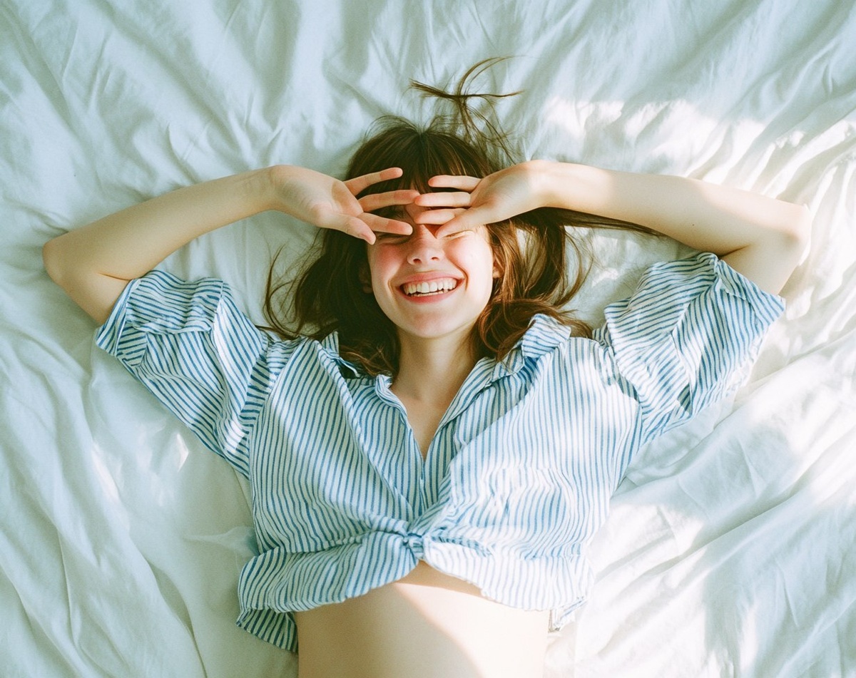 Создано на основе запроса: Photo of a happy woman lying in a disorganized bed, wearing a blue and white striped shirt, covering her eyes