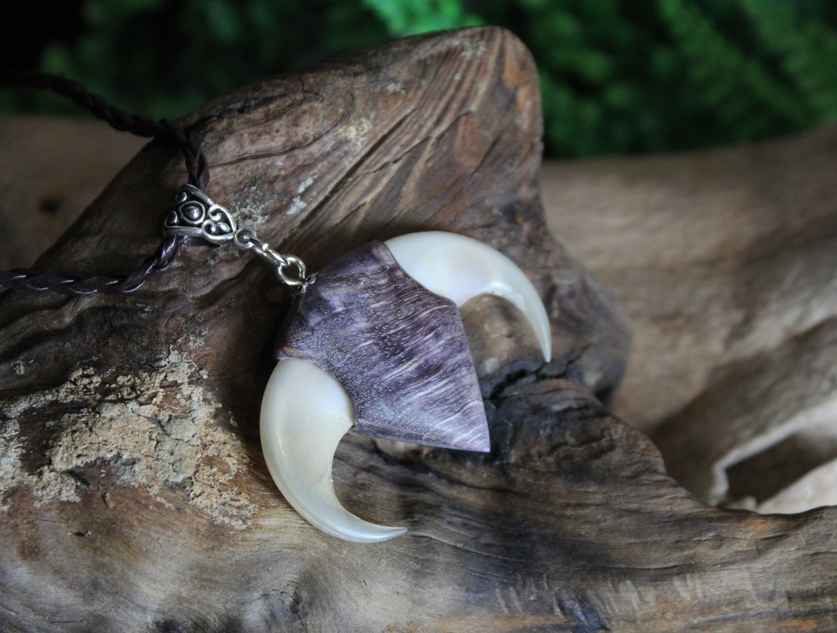 Амулет-лунница из карельской березы и когтей рыси. Рысь животное Зеваны (Деваны, Ваны -одно и то же) Женщины ценили рысь, за её материнские и бойцовские качества. СИМВОЛ МАТЕРИ ВОИТЕЛЬНИЦЫ. Рысь символ доброй и дружной семьи, где каждого любят и ценят и защитят. РЫСЬ зверь скрытых тайн. Тайн, которые перед вами будут открыты. Если вы хотите, что бы люди вам доверяли, наденьте на себя коготь рыси, и с вами начнут делиться своими секретами. По этому, те кто работает с договорами, и если работе построена на убеждении людей в чём либо, то лучшего амулета для этого не сыскать. Так же тем, кто находится в духовном поиске, здорово поможет лапки рыси, говорят, что тем у кого они есть (чаще всего их делают в виде маленьких кошельков) приходит озарение. РЫСЬ как и волк, служит тотемом братства воинов, тотемом духа выносливости, прозорливости. Но чаще это были всё же братства женщин воительниц и охотниц. Если вспомнить мифологию, то скандинавская богиня Фрейя ездила по миру в колеснице, запряж