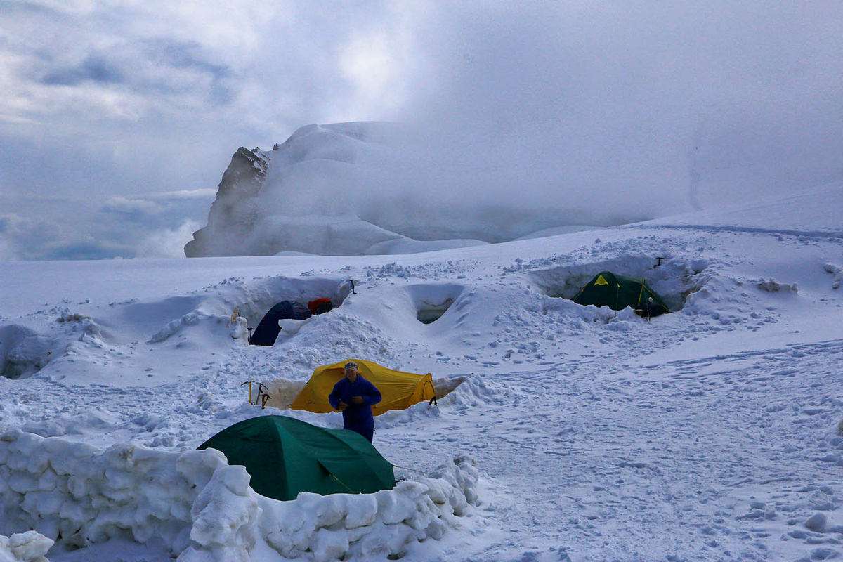 Внизу я собрал ряд дубеющих на ветру под снегом коллег и увел вниз в хижину. Женя сопротивлялась, ожидая Володю. Но мой аргумент, что лучше она его встретит в виде живой девушки в хижине КСС, чем замерзшим столбиком на леднике, действие возымел и она ушла с нами.