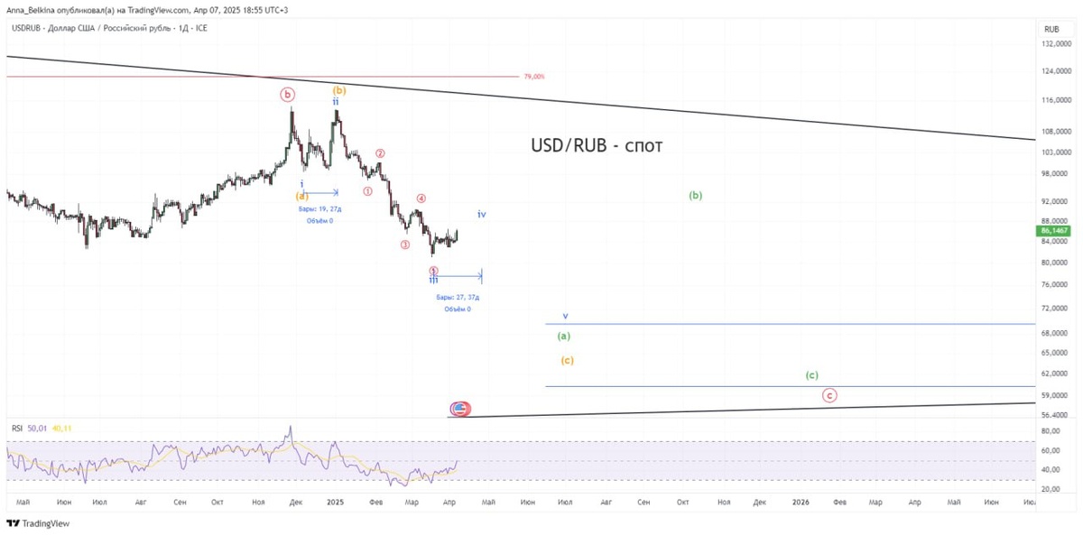По доллар-рублю картина без изменений, в развитии локальная коррекция в волне iv of (a) of [c] треугольника.