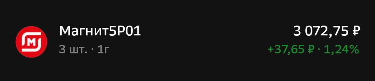 Сегодня покупаю три облигации Магнит: «Магнит» — сеть розничных магазинов, третья по выручке частная компания России. Основана в 1995 году в Краснодаре Сергеем Галицким, владевшим и управлявшим компанией на протяжении первых лет деятельности, с 2021 года крупнейший акционер — инвестиционная компания Marathon Group Александра Винокурова. Облигация: Магнит5P01 Номинал: 1 000 ₽ Цена: 101,61% от номинала = 1 016,1 ₽ Периодичность выплат в год: 12 Размер купона, % годовых: 21.5