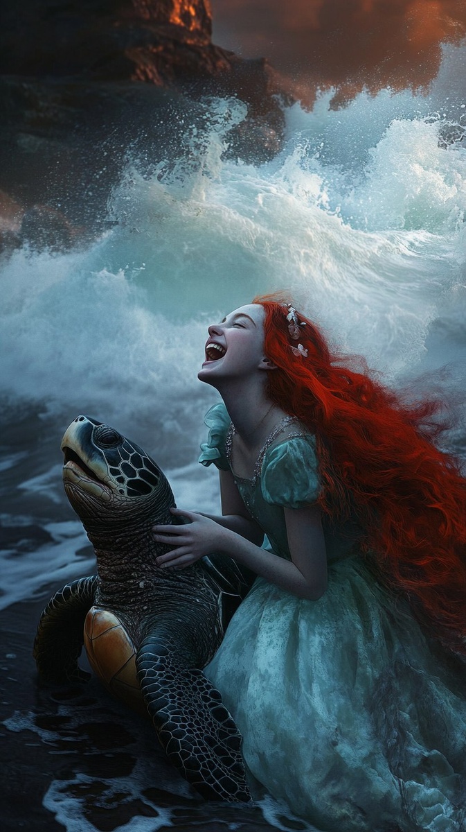Создано на основе запроса: Red-haired Alice laughing at the Mock Turtle beside a dramatic ocean, large waves crashing behind them