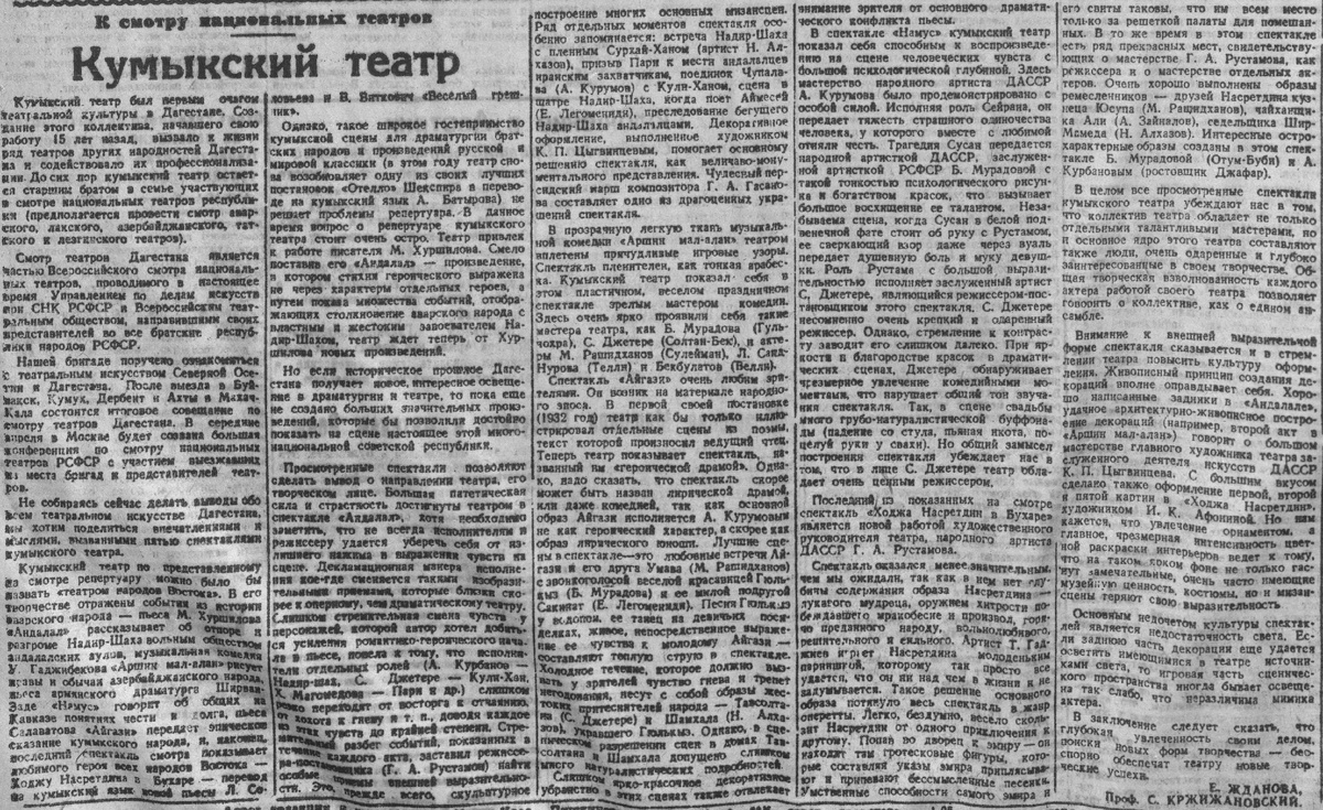Кумыкский театр, его жизнь и перспективы Кумыкский театр был первым очагом театральной культуры в Дагестане. Его создание 15 лет назад дало толчок к развитию других национальных театров в республике и способствовало их профессиональному росту. Кумыкский театр остаётся главным в семье театров национальных республик, которые будут участвовать в смотре. Предполагается, что в рамках этого мероприятия будут представлены аварский, лакский, азербайджанский, татский и лезгинский театры. Смотр театров Дагестана — часть Всероссийского смотра, организованного Управлением по делам искусств при СНК РСФСР и Всероссийским театральным обществом. Наша бригада посещает театры Северной Осетии и Дагестана, включая кумыкский, и проведет итоговое совещание в Махачкале. В апреле в Москве состоится конференция по итогам смотра. Репертуар Кумыкского театра разнообразен: от пьес М. Хуршилова и Л. Соловьева до русской классики, включая «Отелло». Однако вопрос репертуара остается острым. Театр привлекает писателя