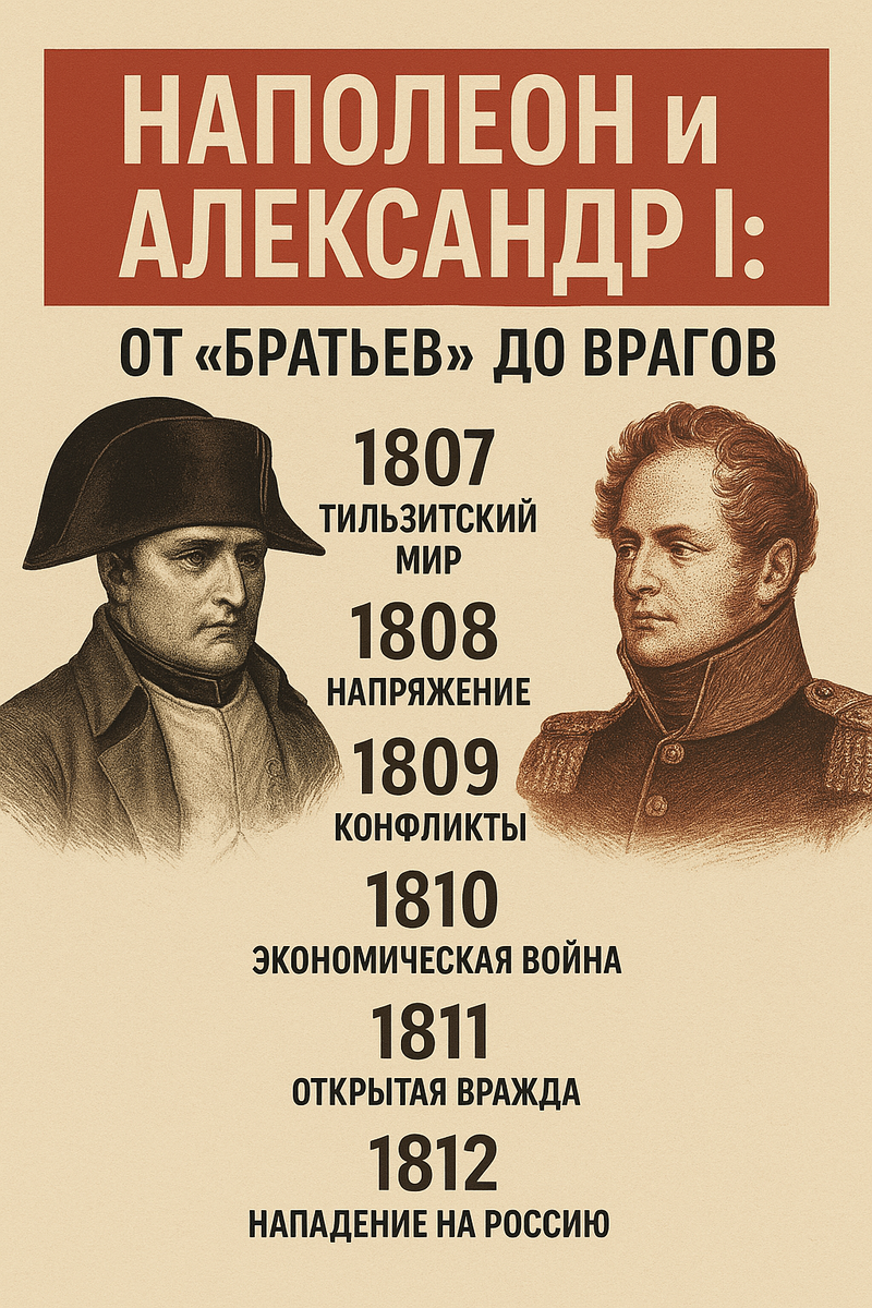 1807 год. Два императора встречаются на плоту посреди реки Неман. Они обнимаются, улыбаются, называют друг друга «братом» и «другом». Проходит всего 5 лет — и один сжигает Москву, а другой клянётся никогда не вести с ним переговоров. Что пошло не так между Александром I и Наполеоном после Тильзитского мира? Вот настоящая история — по датам, по фактам и без прикрас. 7 июля 1807 года — Тильзитский мир После разгрома русско-прусских войск при Фридланде (14 июня 1807 года), Александр I соглашается на переговоры. Место встречи — плот на реке Неман, в городе Тильзит (ныне Советск, Калининградская область). Что подписали: • Россия признаёт все завоевания Франции, • Присоединяется к континентальной блокаде Англии, • Получает свободу действий в Финляндии (что позже приведёт к Русско-шведской войне 1808–1809), • Пруссия — унижена, лишается половины территорий. Александр и Наполеон фактически делят Европу пополам. Всё выглядит как союз века. Но… 1808 год — конфликты начинают нарастать • Р