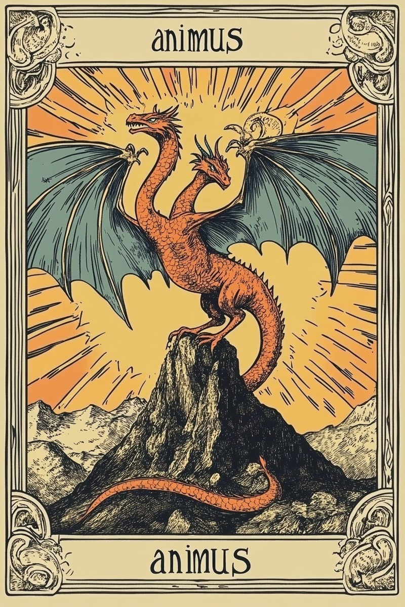 Создано на основе запроса: The tarot card "animus". The Animus is a red dragon with green wings and three heads, perched on top of Mount Olympus. It has four paws, and its tail is shaped like a snake's head, with an ornate border in the style of Ivan Bilibin, a colorful woodcut from ancient Slavic folklore. vector illustration --- Автоперевод: Карта Таро "Анимус". Неплохо получилось? 🤔 https://dzen.ru/id/65c0c65c86e4f837c27b24d7 #ИИ #AI #нейросеть #midjourney #art