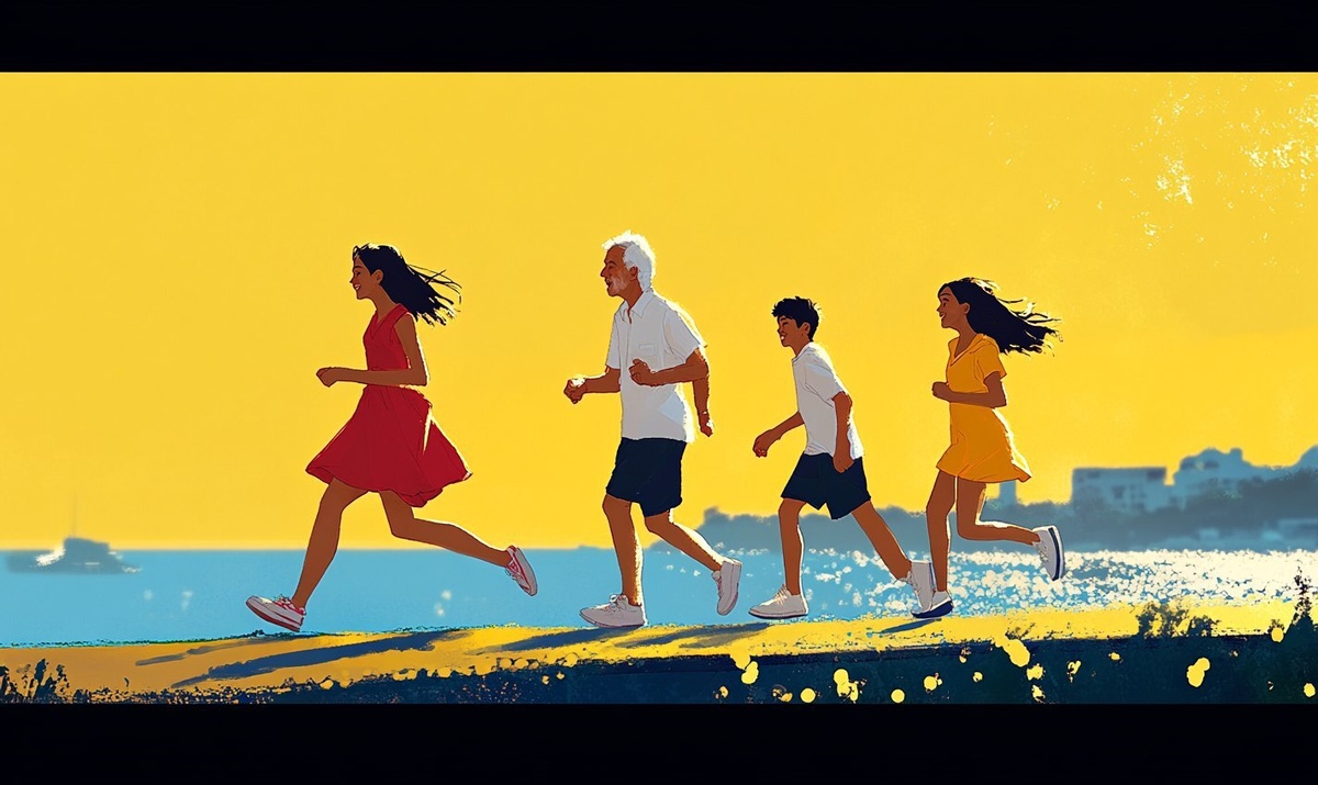 Создано на основе запроса: A young woman in a dress, followed by an old man in a white shirt and dark suit pants, followed by a young man