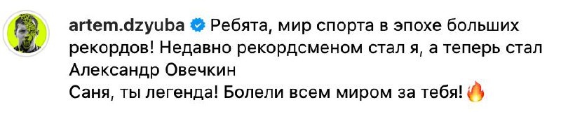 «Ребята, мир спорта — в эпохе больших рекордов! Недавно рекордсменом стал я, а теперь — Александр Овечкин». Дзюба, ранее ставший лучшим бомбардиром сборной России и российского футбола в целом, отдал дань уважения Овечкину. Российский капитан «Вашингтона» вчера побил рекорд Гретцки по числу заброшенных шайб в регулярке НХЛ. 🟩 Подписаться | Прислать новость | Читать аналитику