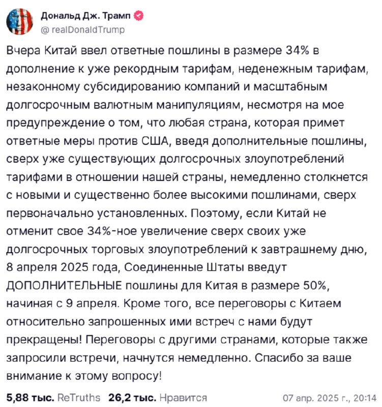 В ответ на пост Не успел я статью дописать, как дело уже дошло до ультиматумов, со стороны Трампа, в отношении Китая. Белый дом сообщает, что пошлины на китайские товары могут достичь 104%. Трампу нужна была новая сделка, аналогичная той, что у него была в первую каденцию с Китаем. Однако, в этот раз, китайцы не идут на уступки.
