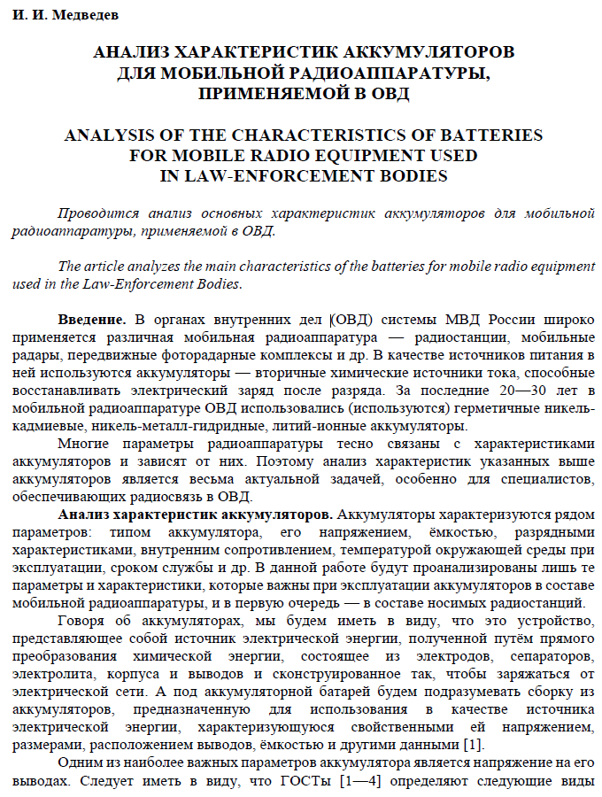 При воспроизведении приведенной информации не забудьте указать ссылку на канал или на первоисточник: Медведев И.И. Анализ характеристик аккумуляторов для мобильной радиоаппаратуры, применяемой в ОВД // Вестник Воронежского института МВД России. – Воронеж: Воронежский институт МВД России, 2016. № 1 – С. 27 – 32.