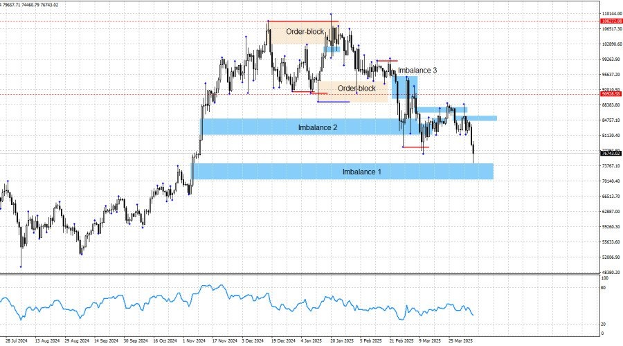 https://basechop.ru/wordpress/?p=37392 Добрый день, уважаемые трейдеры! Биткоин продолжает формирование нового «медвежьего» тренда. Структура остается «медвежьей», цена получила несколько реакций от ближайших «медвежьих» имбалансов, я ожидал падения, и оно произошло. Отработан «бычий» имбаланс (1), который я неоднократно называл целью падения. На мой взгляд, падение может не завершиться и на этом. В ближайшие несколько дней нужно понять, случится ли закрепление котировок биткоина под этой зоной. Если да, то падение приобретет еще более стремительный характер, но нельзя исключать и коррекционный откат. Биткоин упал примерно на 12000$ после того, как Дональд Трамп объявил о взаимных пошлинах для всех стран, и это очень позитивный знак. Он подтверждает правильность сделанных ранее выводов. Я не считаю, что самая «горячая фаза» торговой войны осталась теперь позади. Таким образом, биткоин может упасть гораздо ниже. Главной зоной интереса для продаж выступал «медвежий» имбаланс (3),…
