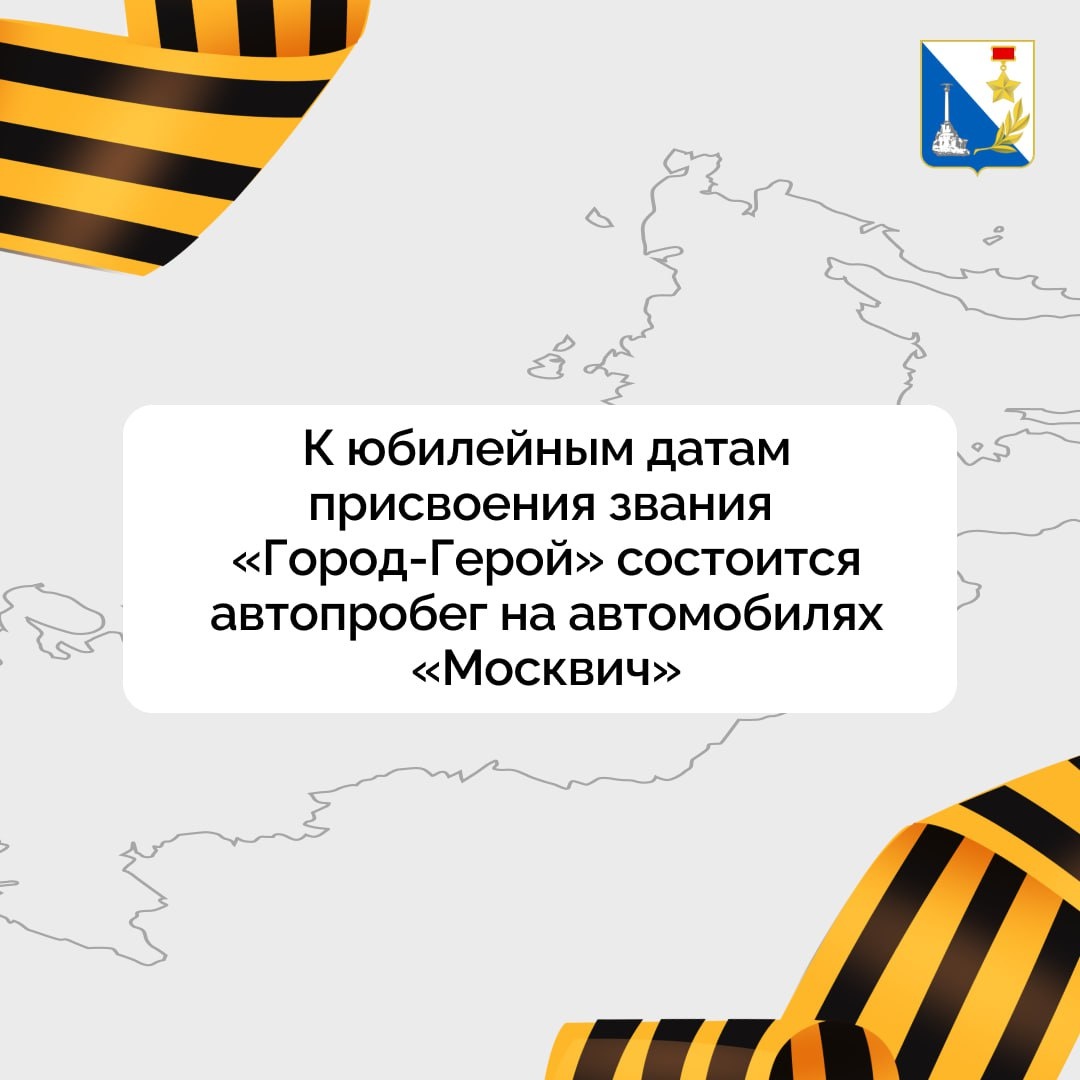 Автопробег «Города-герои — города Героев» пройдет через Севастополь 📆 В этом году Севастополь отмечает 60-летие присвоения звания «Город-Герой» вместе с Москвой, Санкт-Петербургом, Волгоградом и Брестской Крепостью. Московская городская Дума запускает проект «Города-герои — города Героев». В рамках проекта состоится автопробег по городам-героям России и Белоруссии на автомобилях «Москвич». Участниками автопробега станут герои СВО, получившие инвалидность во время боевых действий. 🎗С 4 по 8 мая маршрут охватит 17 регионов РФ: города федерального значения Москва, Санкт-Петербург, Севастополь; Республики Крым и Карелия; Краснодарский край; Московскую, Ленинградскую, Смоленскую, Ростовскую, Волгоградскую, Воронежскую, Липецкую, Тульскую, Мурманскую, Тверскую и Новгородскую области. Финиширует автопробег 8 мая на Поклонной горе в Москве, в этот же день состоится телемост со всеми городами-участниками проекта. Правительство Севастополя