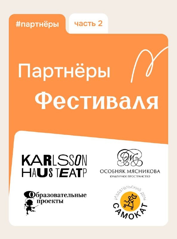 Продолжаем выражать благодарность нашим партнерам: 🙌 Культурное пространство Особняк Мясникова за розыгрыш билетов 🙌 Театр Театр «Karlsson Haus» Haus за подарки участникам игры-квеста 🙌 Образовательные проекты — за подарки участникам Фестиваля 🙌 Издательский дом «Самокат» за чудесные книги для участников Мы рады, что Фестиваль поддерживают такие классные проекты. До новых встреч!
