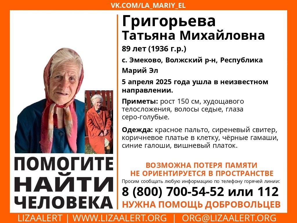 В Марий Эл два дня назад пропала 89-летняя Татьяна Михайловна Григорьева Поисковый отряд «ЛизаАлерт» Республики Марий Эл просит помощи в поисках пропавшей. 5 апреля пенсионерка ушла в неизвестном направлении из села Эмеково Волжского района. Бабушка не ориентируется в пространстве, возможна потеря памяти. Всю информацию можно сообщать инфоргу Анастасии Скай по телефону 8-968-680-70-47, телефону горячей линии 8-800-700-54-52 или 112.