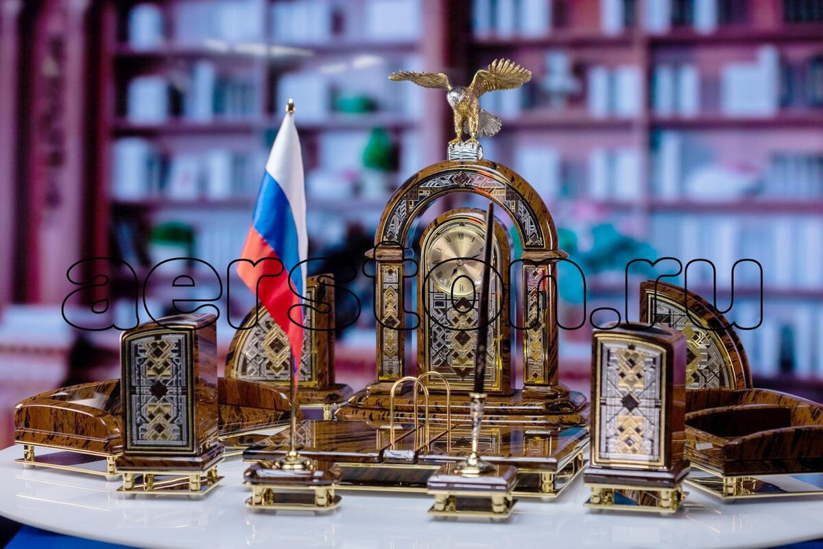 Письменный набор ПРЕЗИДЕНТСКИЙ ЭТАЛОН ⨳ Материалы: обсидиан, ювелирная латунь, латунное литье, золото, серебро. ⨳ Содержание драгоценных металлов: Серебро (925), Золото (999,9) - 9 мкм, Никель - 20 мкм. ⨳ Габаритные размеры: часы 395 х 260 мм, визитница 160 х 150 мм, карандашница 140 х 85 мм, подставка для календаря 80 х 290 мм, подставка для бумаг с ручкой 80 х 320 мм, длина ручки 200 мм, подставка для бумаг с флагштоком 310 х 320 мм. ⨳ Изделие укомплектовано: подарочной коробкой из натуральных пород дерева. ⨳ Авторская ручная работа. ✔️Подпишись на наш канал ✍️ ✔️Жми на палец вверх! 👍 🔸 Интернет магазин 📱 Телеграм канал 🔹 Дзен